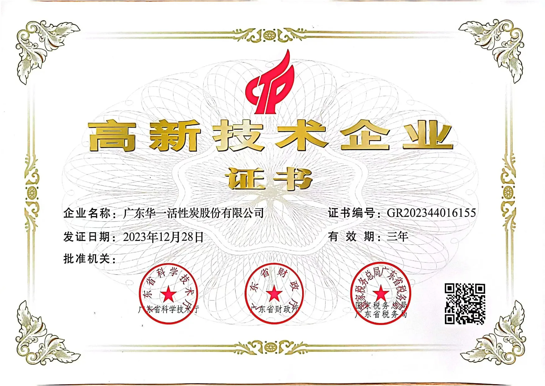 On December 28, 2023, Yicarb Activated Carbon Co., Ltd. (hereinafter referred to as "Yicarb Co., Ltd.") was awarded the "National High-tech Enterprise" certificate jointly issued by the Ministry of Science and Technology, the Ministry of Finance, and the State Taxation Administration. This honor marks another authoritative recognition of Yicarb Co., Ltd.'s technological strength.
