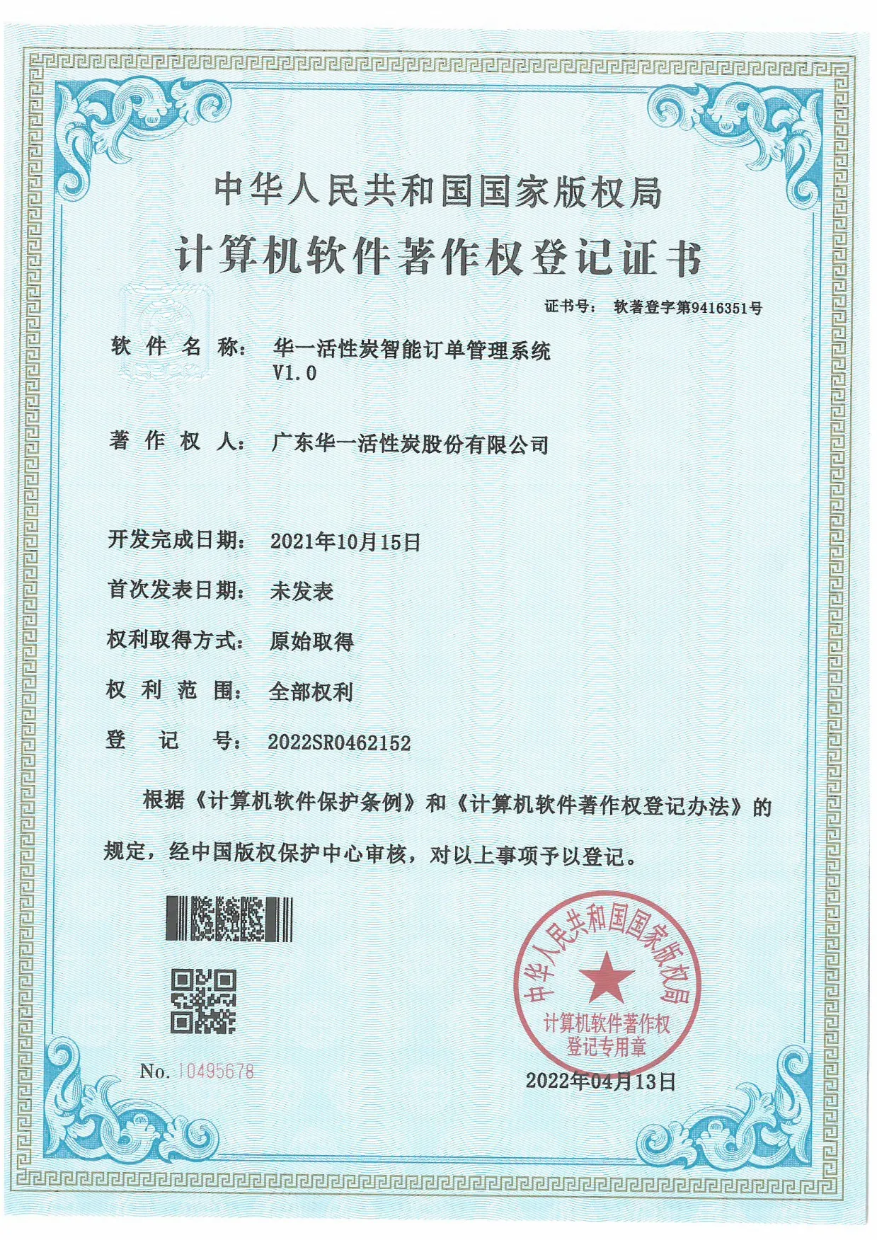 Amid the backdrop of technological innovation driving industry development, Guangdong Yicarb Activated Carbon Co., Ltd. (hereinafter referred to as "Yicarb Stock") announced on April 13, 2022, that its self-developed "Yicarb Activated Carbon Intelligent Order Management System V1.0" had officially obtained a software copyright registration certificate issued by the National Copyright Administration. This achievement marks an important step forward for Yicarb Stock in the fields of informatization construction and intelligent management, and also demonstrates the company's strong strength in technological innovation.
