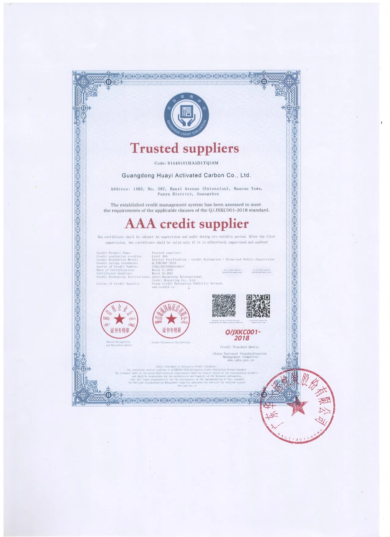 On March 11, 2020, it was a memorable day for Guangdong Yicarb Activated Carbon Co., Ltd. (Yicarb Stock). On this day, the company was honored with the Trusted Supplier AAA Credit Supplier award certificate. The acquisition of this international honor undoubtedly added a splendid chapter to Yicarb Stock's presence in the global activated carbon market.
